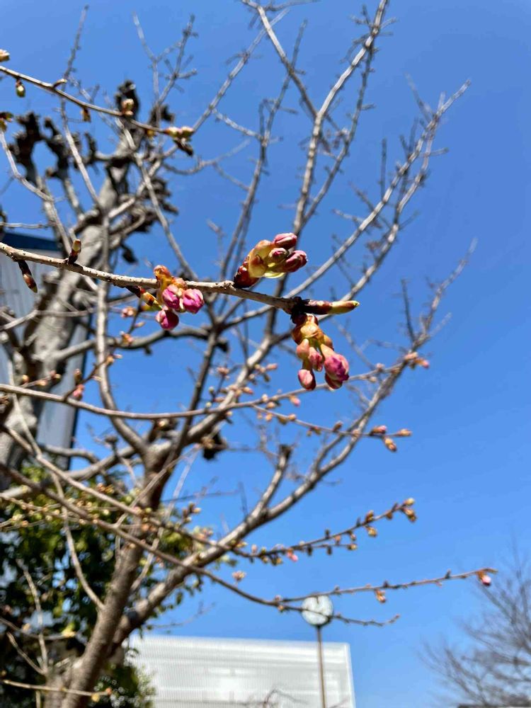 里桜🌸のつぼみがピンク色に染まってきました☺️