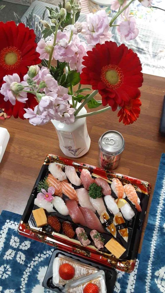 お昼にお寿司とケーキ🍰で二人で乾杯🍺💥🍺