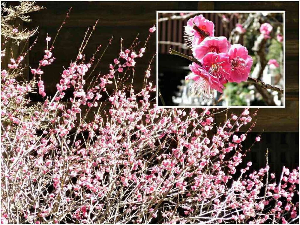 遠くの方でコウバイ(紅梅)が陽の光で輝いています。