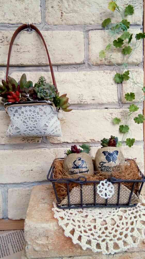 レースの多肉バック❣️とても、素敵ですー、どこに飾っても、✨オシャレで目立ちますね❣️