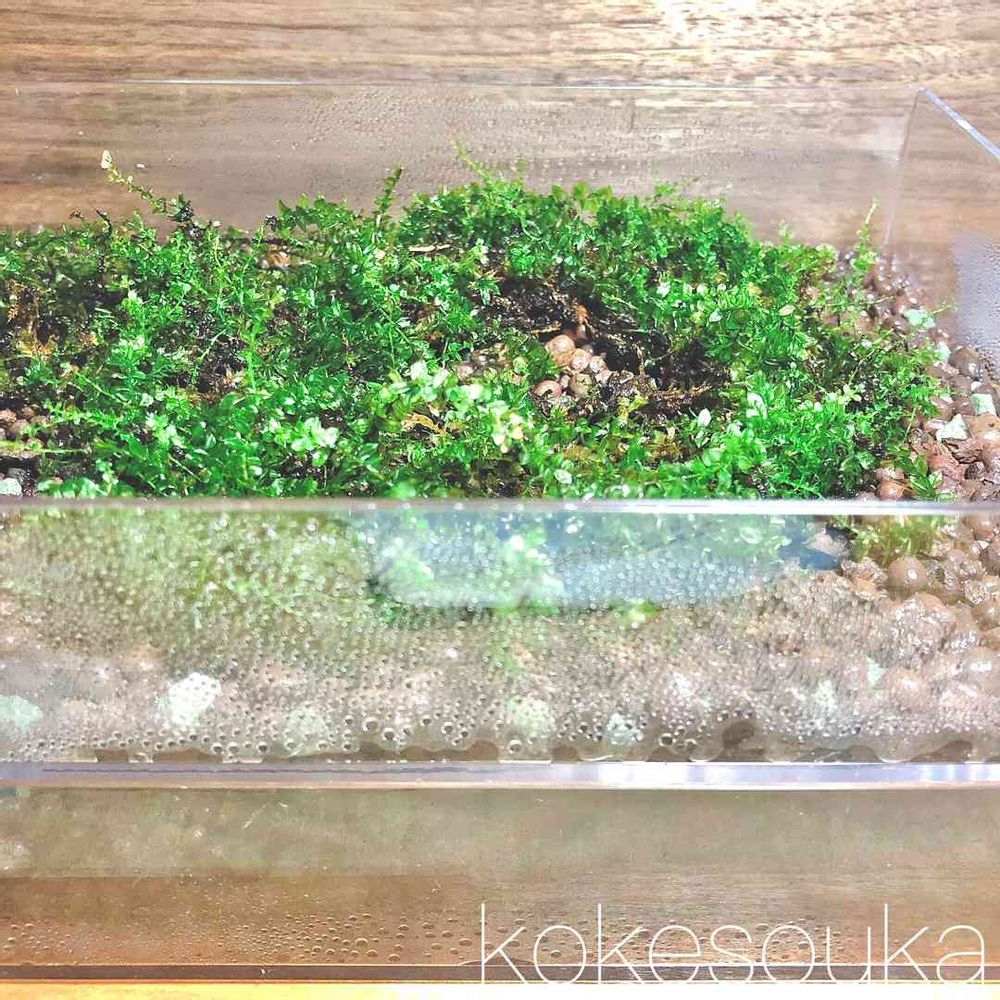 写真はアクアショップで入手したコツボゴケを洗浄後、痛んだところを取り除き、高さ40mm × 横159mm × 奥行220mmクリアケース(積み重ねて使えます)内にしいた小粒ハイドロボール上に置いています。普段はふたをして湿度を保っているため、新芽がどんどん広がっています。