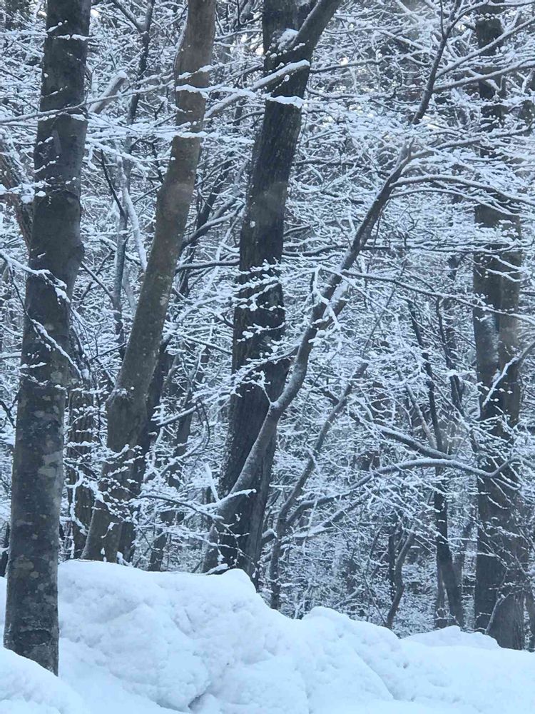 (孫だけ)滑る人は一人凄い吹雪で帰り道の雑木林は一面花が咲いてました。