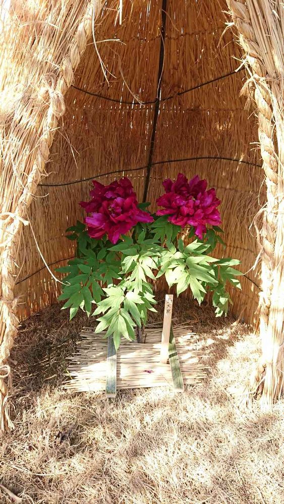 藁囲いに守られた牡丹「島大臣」💕