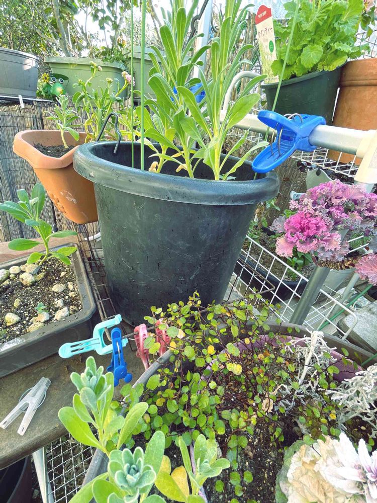 2022ー3ー1 (火) 種蒔きストック 育ちの良かった3本は菊鉢 寄せ植えの中に3本 先日うえかえたハンギング買った苗の両脇に1本づつ 枯らしてしまった木瓜の鉢に1本 🙄(3+3+2+1・・・9😧🤔😅)6ヵ月と2週間ちょっと🤏の今