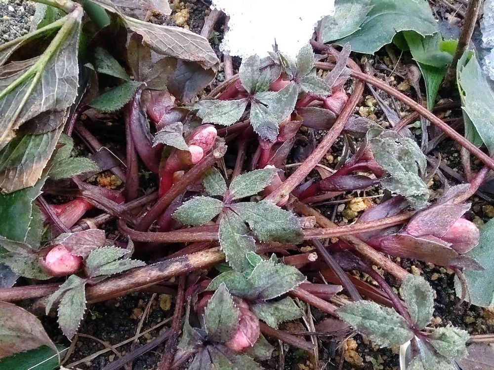 やっと庭の土が見え始め、雪の下からクリスマスローズが現れました🎵