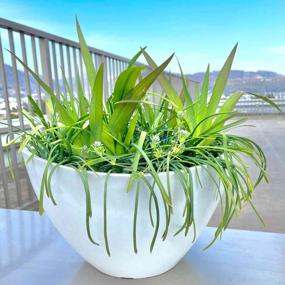 フリージアとムスカリに、カラーリーフを散らした寄せ植え。