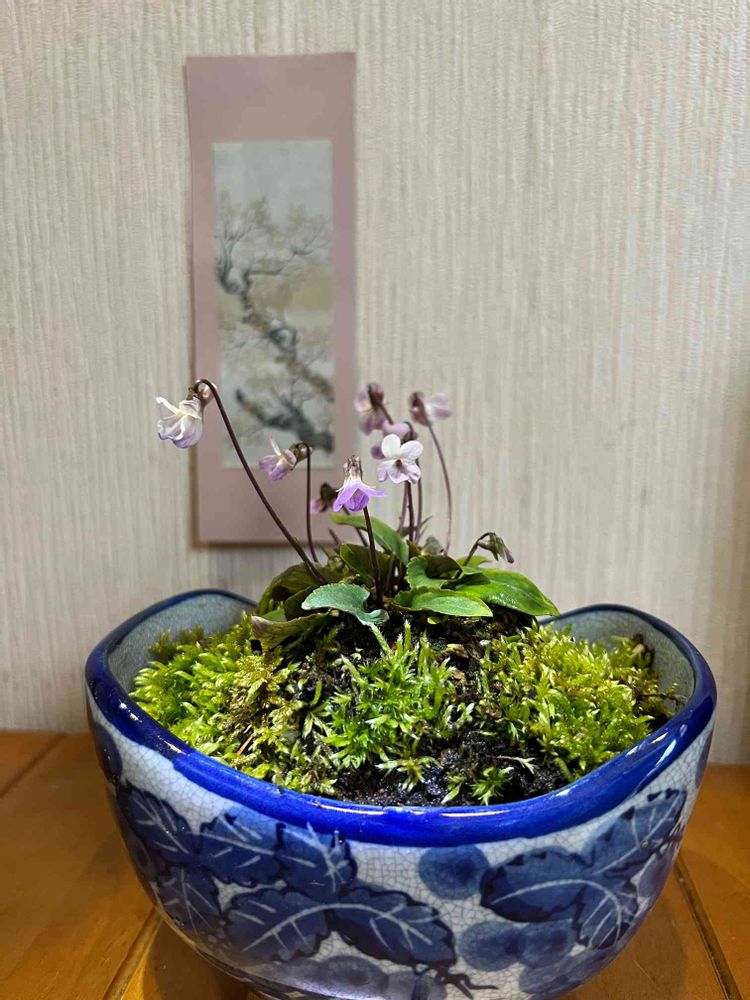 素晴らしいです。素敵な藍の染付の鉢に可愛いスミレ、苔が趣を添えて。