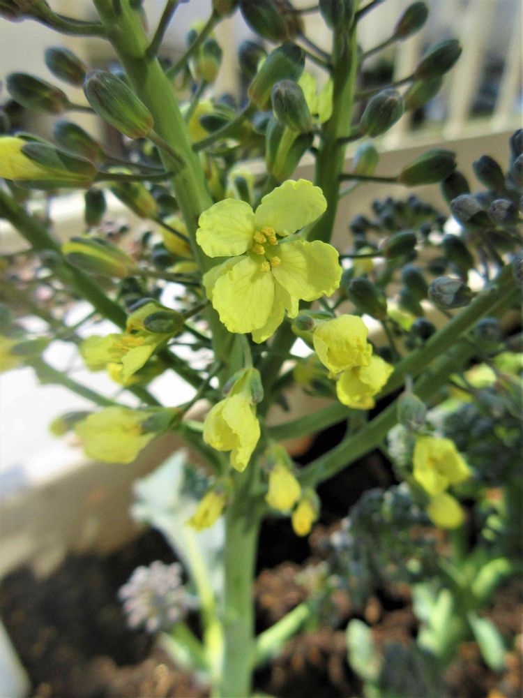 ブロッコリーの軸の部分をプランターに挿してみました。脇芽が出て少しだけ花が咲きました。カワ(・∀・)イイ!!