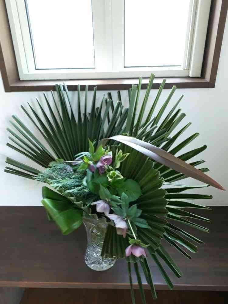 活けこみもシュロの葉をふんだんに使いました。花材は全て教会の庭より調達です。