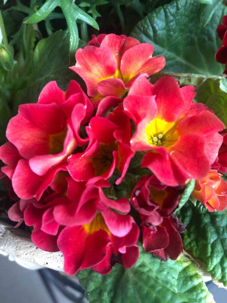 玄関に置いている寄せ植えの中のプリムラ・ジュリアンです。