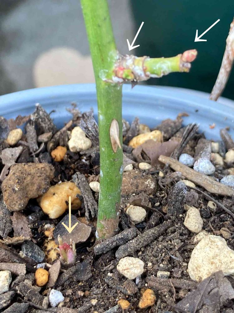 その中で唯一ずっと緑の枝一本状態で枯れもせず、でも芽も吹かずひたすらじっとしていた一本がとうとう芽吹き、根本から芽も出てきました(黄色の矢印)❣️