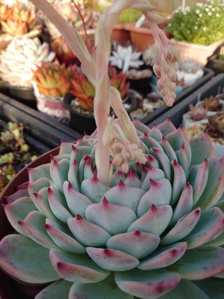 エケベリア 桃太郎の花もだいぶ伸びてきた👍