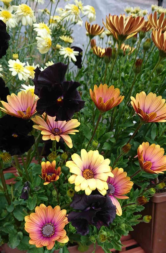 色鮮やかなオステオスペルマムの中で黒いパンジーさんが一瞬、黒猫ちゃんに見えちゃった😲