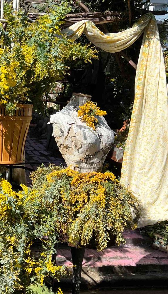 首飾りもスカートもミモザ‼︎のトルソーが迎えてくれるお花屋さんの入り口✨✨✨