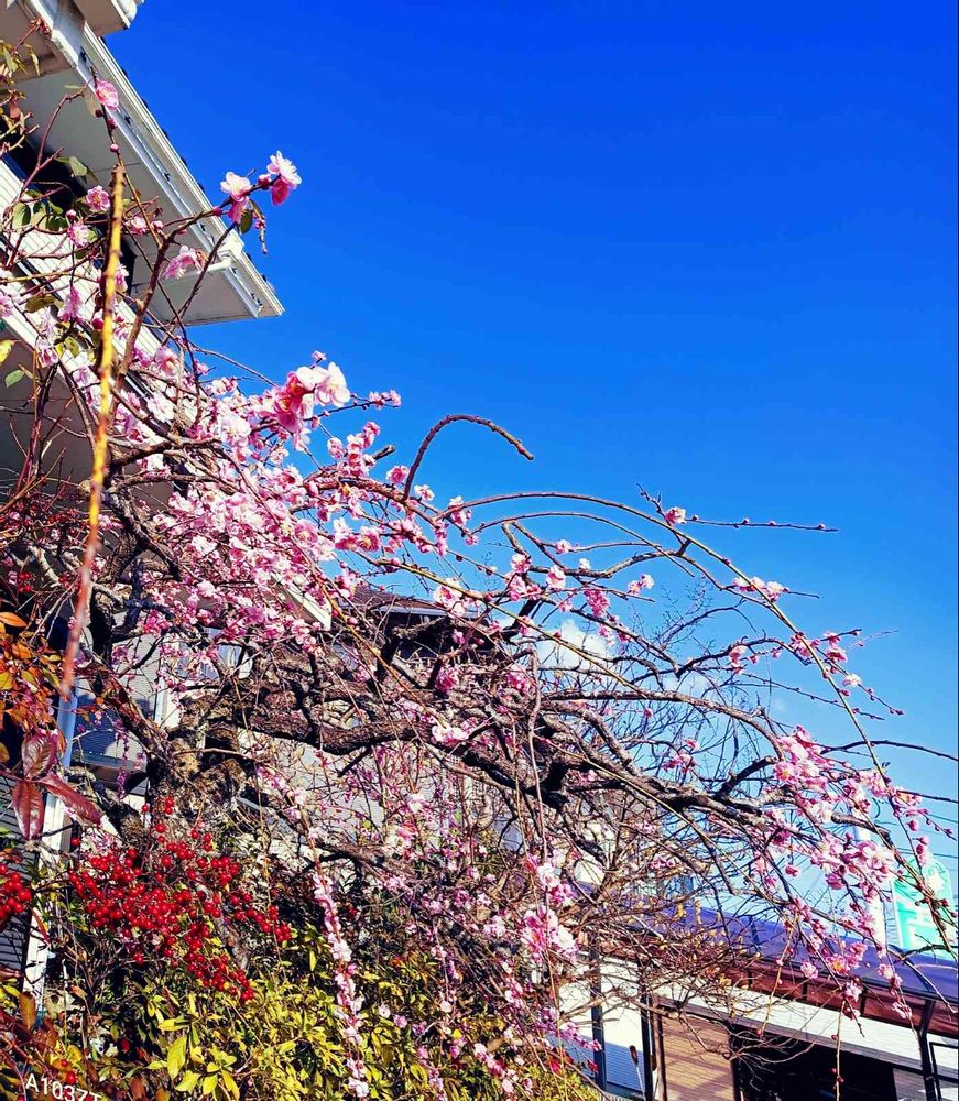 散策中に、郵便局🏣近くのお宅の、枝垂れ紅梅と南天です。