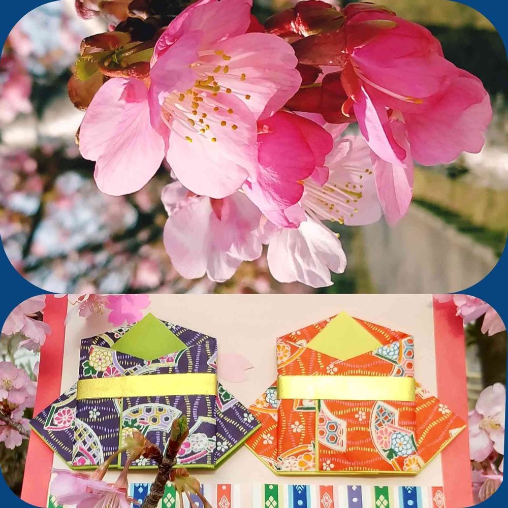 昨日、区内の公園に行って満開間近の河津桜🌸と、折り紙雛人形を撮りました。夜中の投稿でした。😉🎶