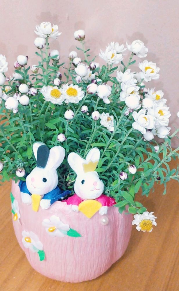 ハナカンザシのお花と鉢と鉢の中から外を見てる👀ウサギ🐇
