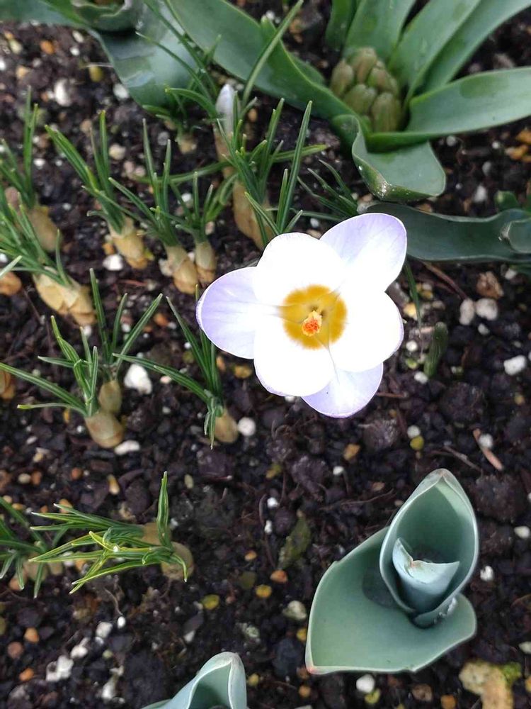 昨年 採れた色々な球根を 大きめの鉢に寄せ植えしていたのですが、🌸早咲きクロッカス🌸が咲き始めました😄