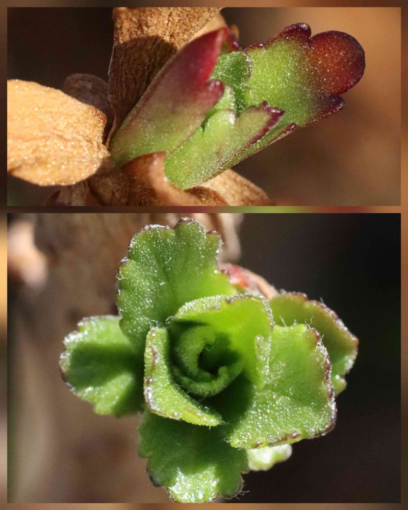 だいぶ暖かくなってきて庭のいろいろな芽も伸び始めています。イソギクの芽も開き始め、緑の花のように見えなくもないかな。
