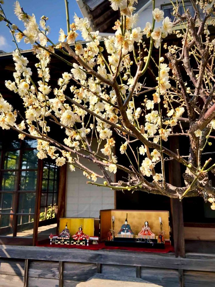 梅の花と渡り廊下から、それを眺めるお雛様🎎たち、、、いいですね🥰💗💗💗