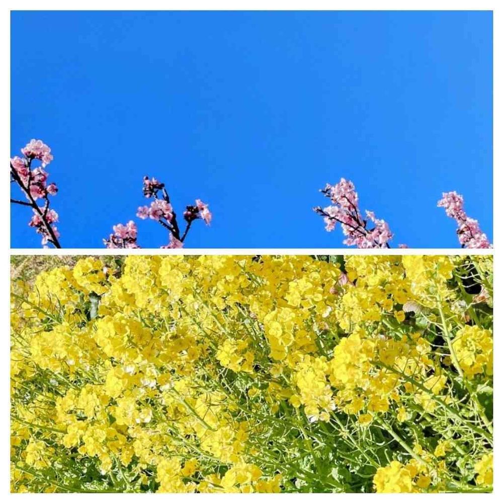 畑の一画で咲いてた、菜の花と…河津桜🌸の梢を映す、真っ青な空❇️💙