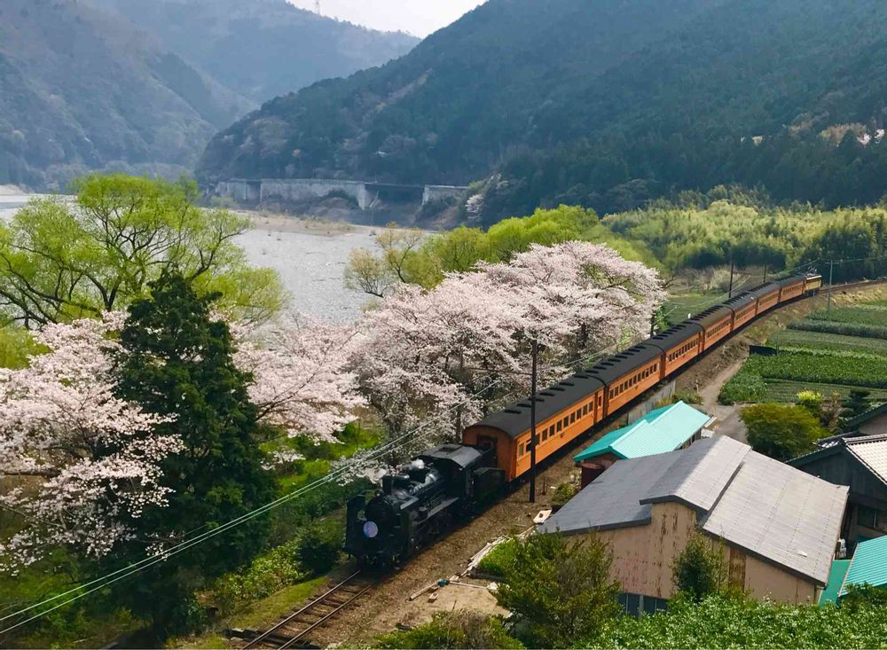 静岡県島田市の大井川鐵道にて、採れたてホヤホヤの桜並木とSLを皆さまに🌸
