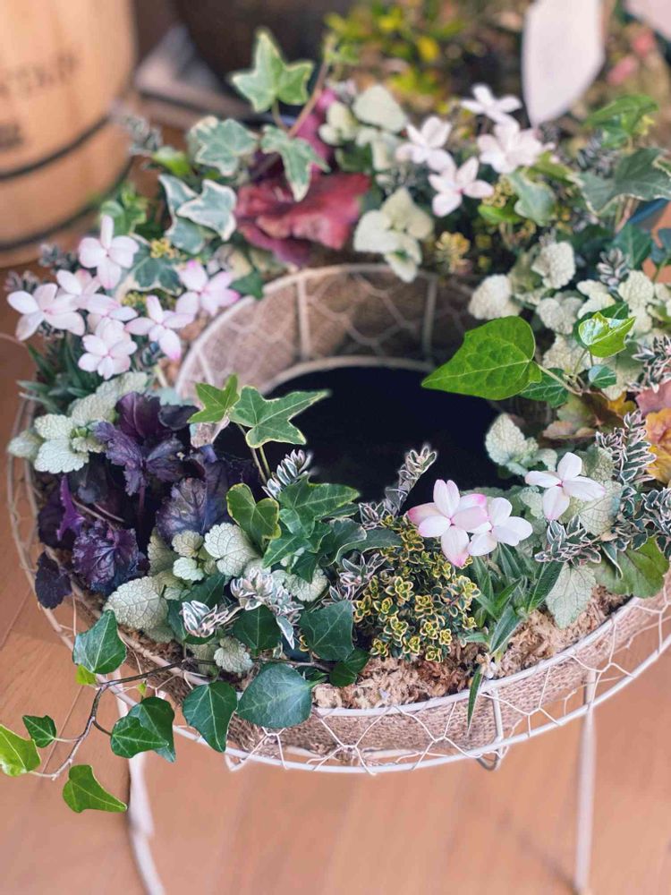アッツ桜、ヒューケラのリース型寄せ植え。