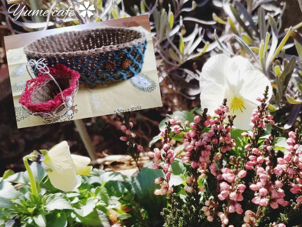 100均の麻紐でネット編み(ブルー)の小物入れを編んでみたのですが、まだ麻紐が残っていたので、ワイヤーの鉢植え(赤)も編んでみました😊🌸