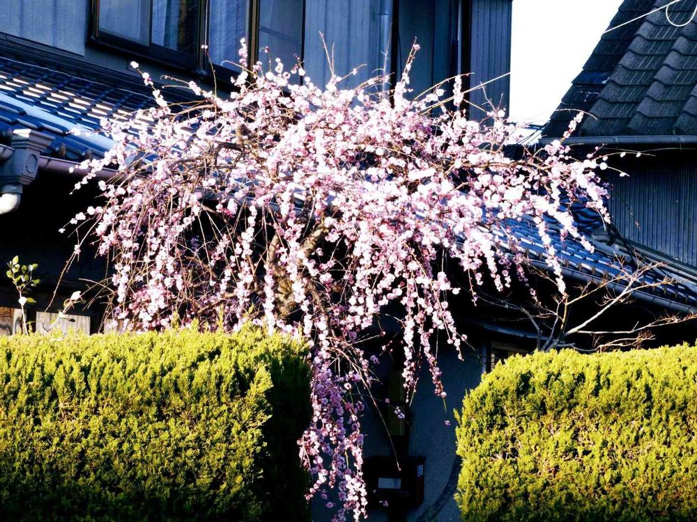 湯田温泉♨️からの帰り道に、県道の向かい側に有るお宅の、枝垂れ紅梅が、生け垣から覗き、綺麗でした。向かい側から撮りました。
