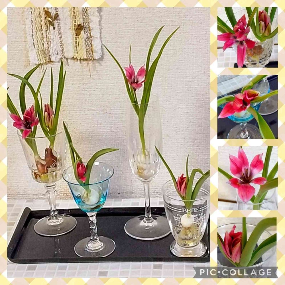 フォロワーさんがやっててチューリップちゃんの水耕栽培 いいな💕と思ってたけど、ワイングラス🍷とか めちゃオシャレ‼️