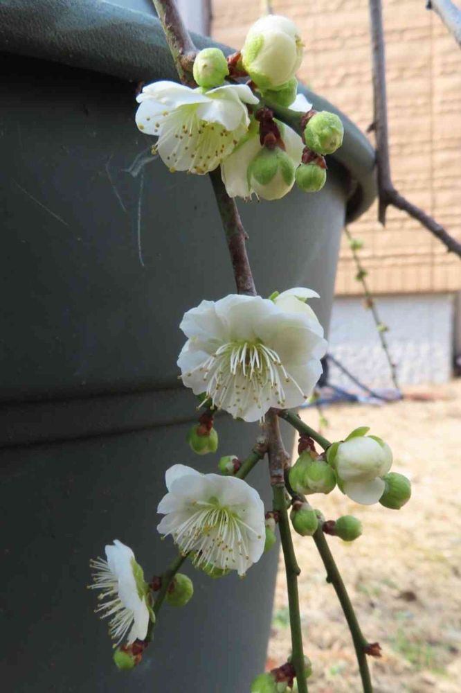 鉢植えの枝垂れ白梅が漸く3分咲きとなり、優しい香りを漂わせています。