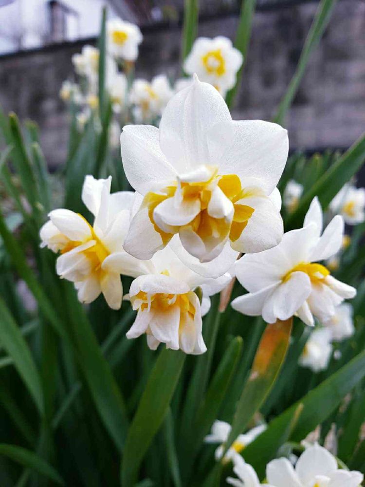 この水仙の群落、八重咲き水仙と肩を並べる近さにノーマル日本水仙も植わっている。