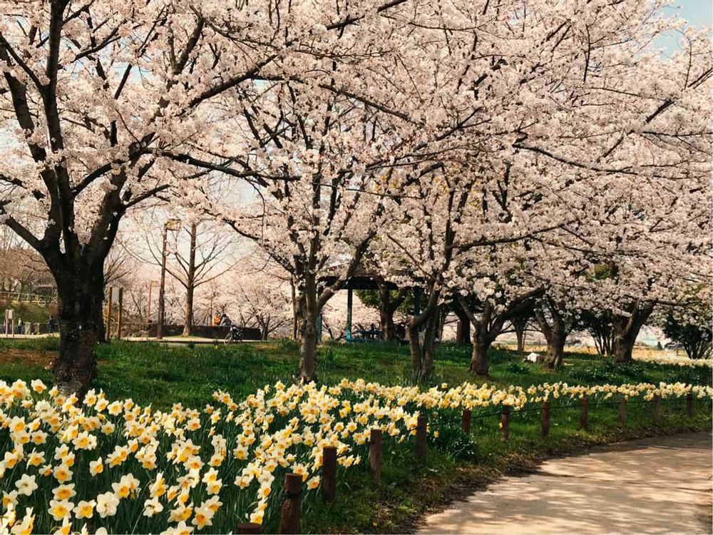 そうなんです。池の周りに桜があって、その木の下に水仙が広がっています💕