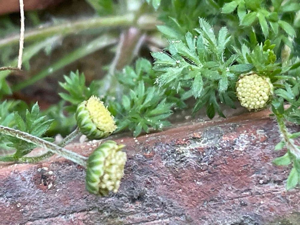 サザンカの生垣の下に生えるマメカミツレさん💠