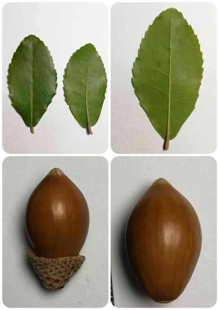 葉は厚く、硬いです。堅果は下側がすぼみ、殻斗は薄く杯形。総苞片は鱗状で、分類上はカシではなく、ナラです。