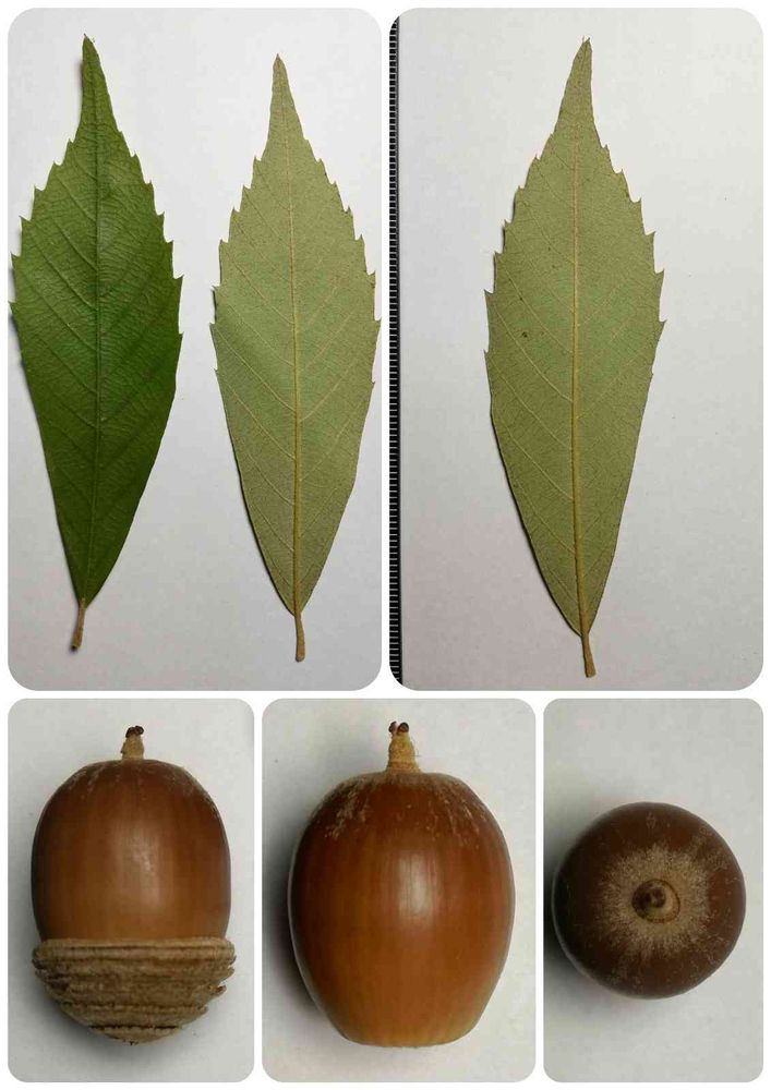 葉の上半分に鋭くめだつ鋸歯があります。裏には黄褐色の毛が密生しています。堅果の上部に毛があります。殻斗は杯状で浅いです。