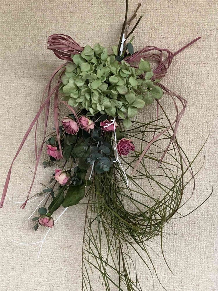 ミモザの細い枝と小さなバラと紫陽花のスワッグです💗
