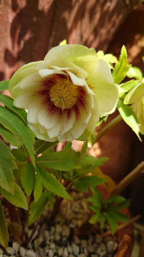 ゴールド入りのオフホワイトに赤いスラッシュが入ったクリスマスローズ