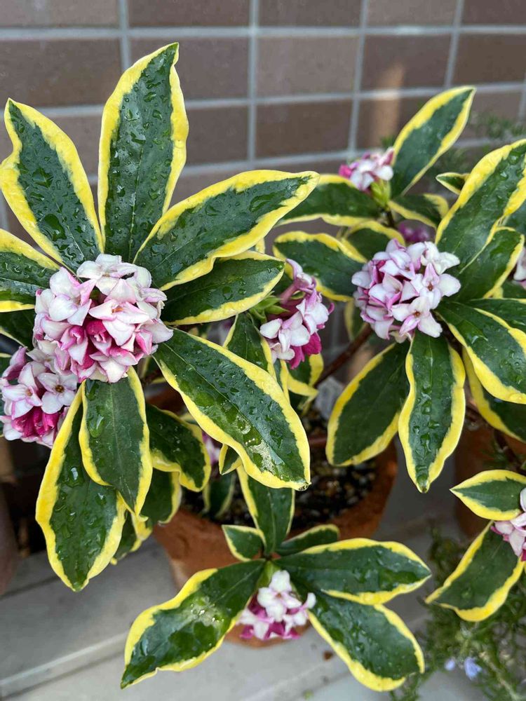 数年前、裏庭で枯らして、リベンジの覆輪沈丁花。大事に大事に育てた箱入り娘。