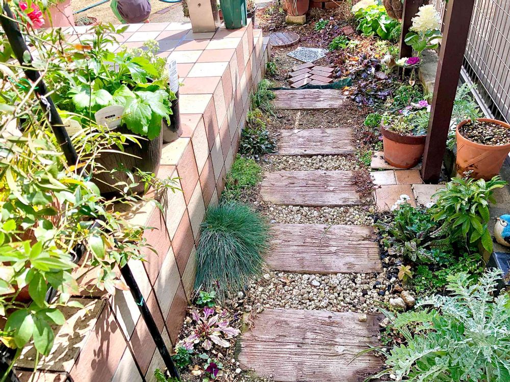 お庭造りのはじめの頃、日当たりのいい ヒメイワダレソウが咲くナチュラルな小道だったんですけど、お隣の大きな倉庫によって日陰の場所になったので💦ヒメイワダレソウを抜いて、小道造りコツコツ季節によって、変わる小さなこの小道今は、とっても大好きです💕
