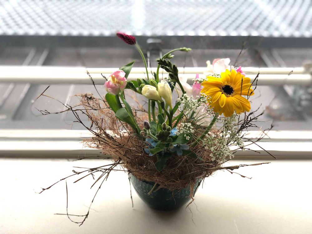 鳥の巣をイメージしたベースに、春のお花をアレンジ。