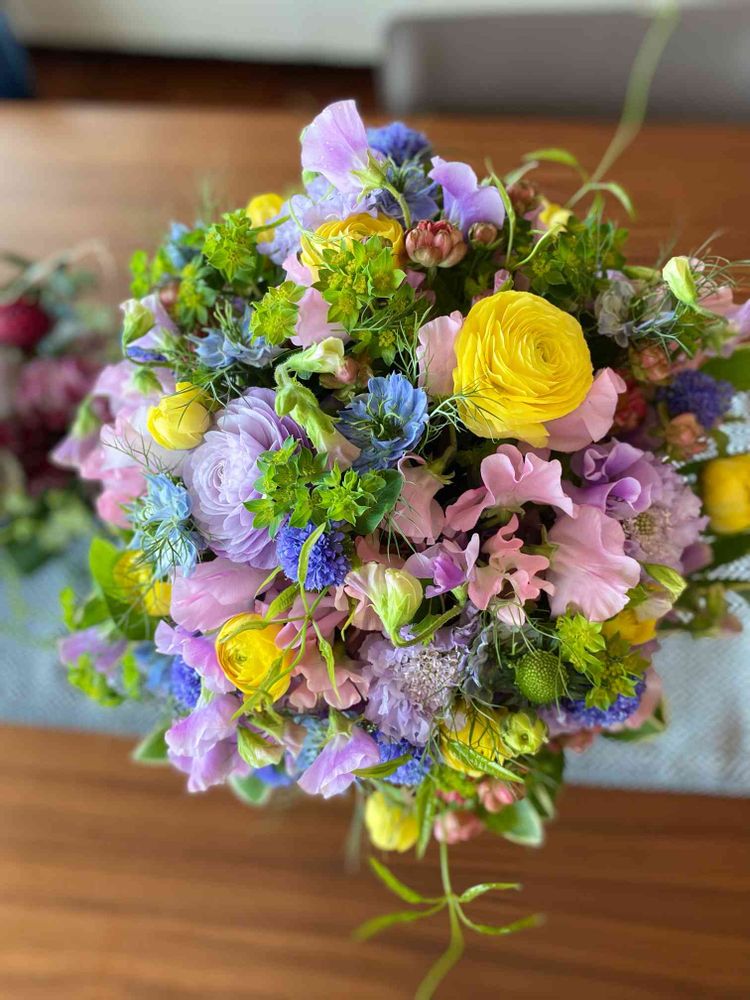 スイートピー、ハナキンポウゲ、ニゲラ、もう一つの青いのは、ブルーシンブルフラワー?と、ググると出てきたのですが合ってるのかな💦