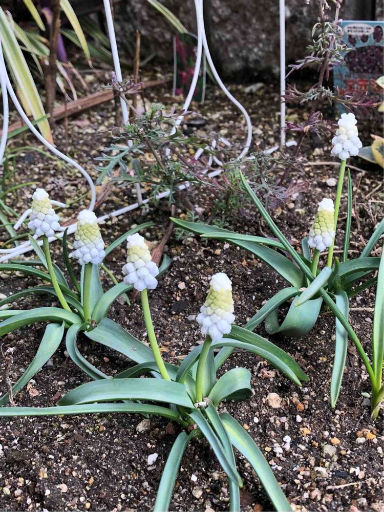 こんにちは🎶昼過ぎから急に強い風💦多肉さんの植付けをしようと思ってましたが、飛んでいったら嫌なので見送りました😅白いムスカリ、春が近づいてきてますね🥰💕