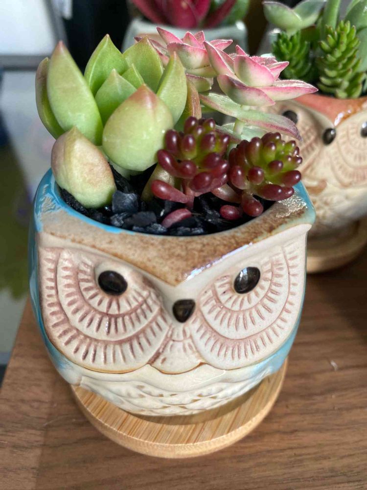 Amazonで購入したふくろうの植木鉢かわいい😳さっそく届いたので植えてみました🍀*゜左端の緑の子は挿し木?セットみたいなパッケージで購入した子で、根っこがでてきたところです♪