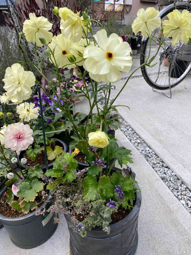 ラナンキュラスラックス リタイを主役にお家にあったお花とリーフを使って寄せ植えにしました🤔単品植えの方がいいんだろうけど、他のお花とのコラボも見てみたい♬