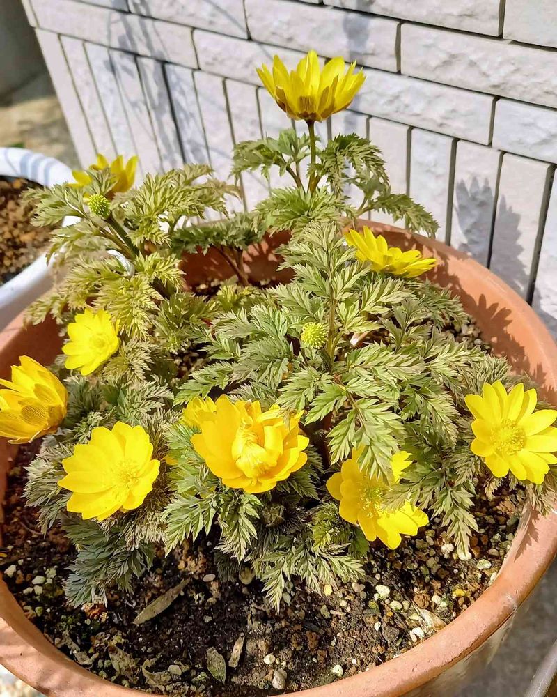 わんさか福寿草の鉢植えを見たら、ついつい鼻を近づけて、匂いを嗅いでみちゃいます。福寿草って、匂い、どんな⁈
