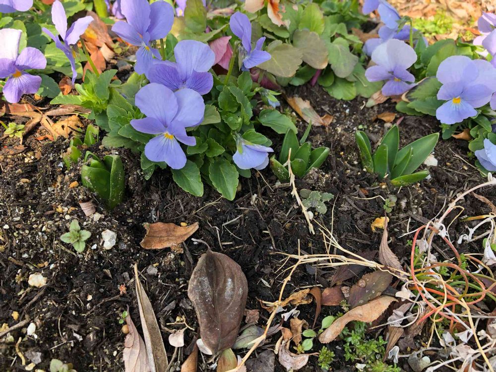 落ち葉片付けてなくて、すいません💦種から育てたビオラの横に、ヒヤシンスの芽が出始めました。春らしくなって楽しみ。