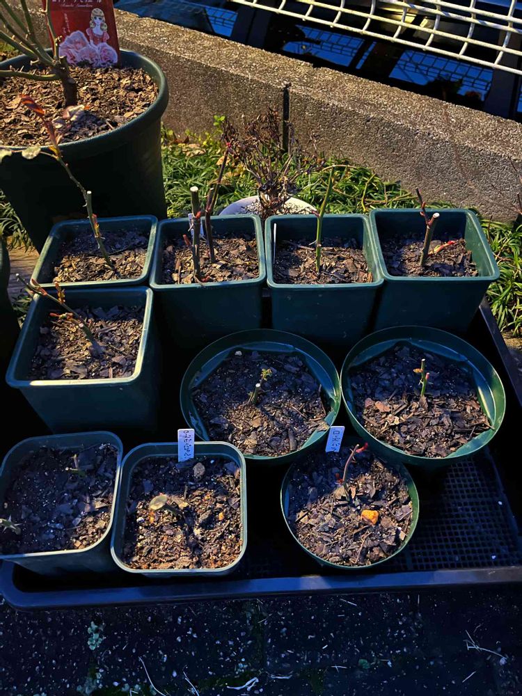 黒のビニールポットに赤玉土を入れ挿木していて根が付き出してからは置き肥したり、液体肥料を定期的に与えていました。スペースの問題もあり根が張ってからは思いっきり野ざらしでした。💦💦3月に入り暖かくなり始めて枯れたのかな?と、思わせていた挿木達も段々と芽を付けて来たので本日バラ専用土を入れたひと回り大きなプラ鉢へ植替えしました。根はかなりしっかり張っていたので安心しました。