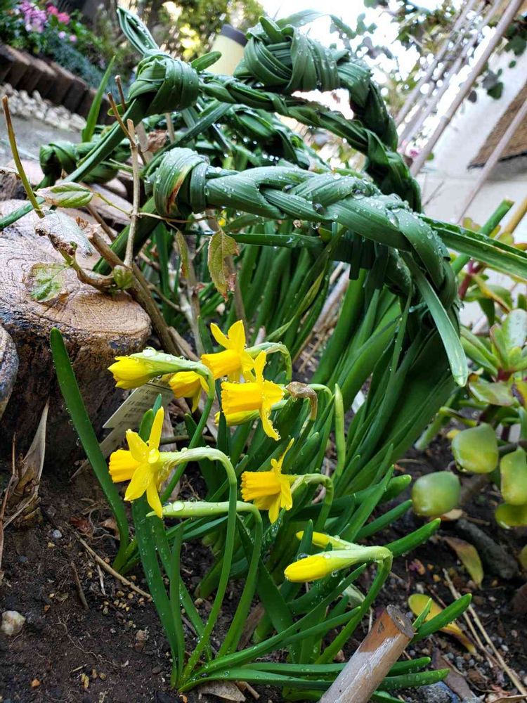 向こう側は日本水仙の葉っぱ。来年のために葉っぱから養分を蓄えるので放っておくのですが、他の花の日差しを遮ったり見映えが悪くなるので、結んでおきます‼️