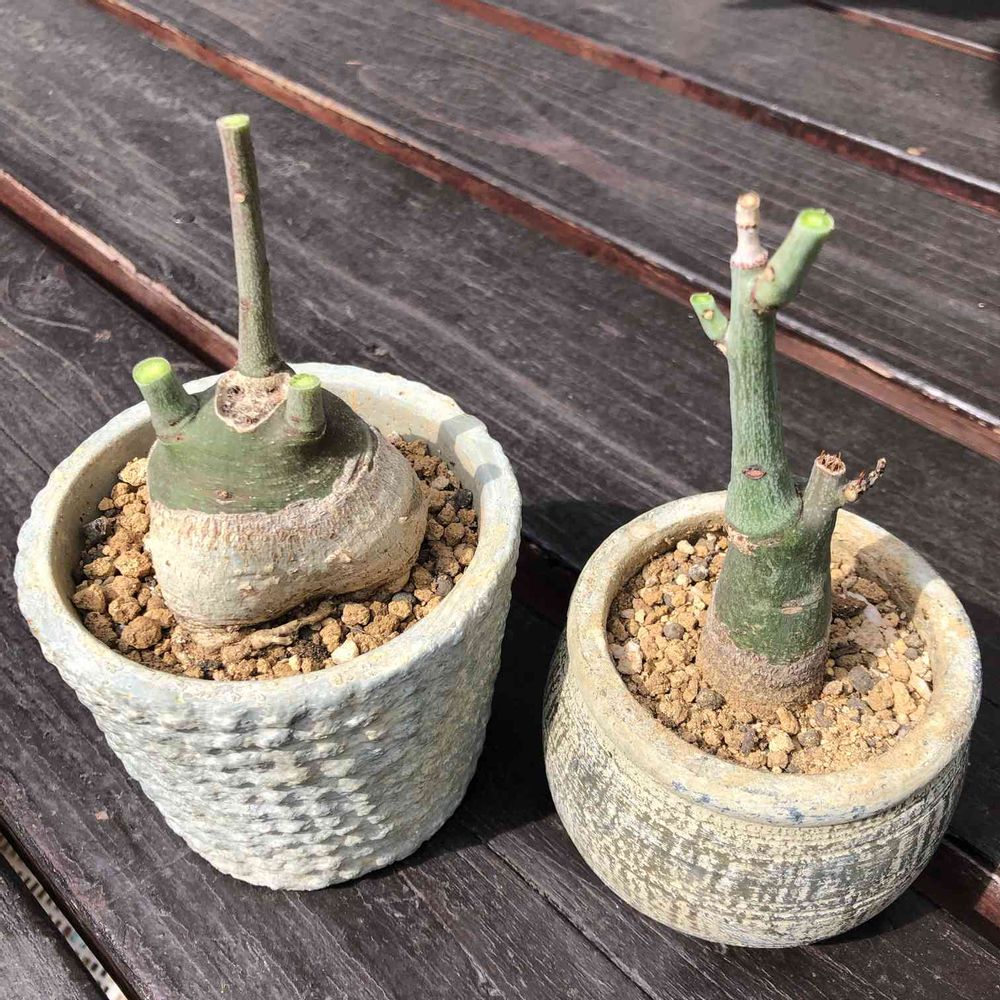 元株と挿木した株で一昨年強剪定しました。挿木の方も塊根は太らないもののアデニアグラウカらしくツートンカラーになり成長しています。